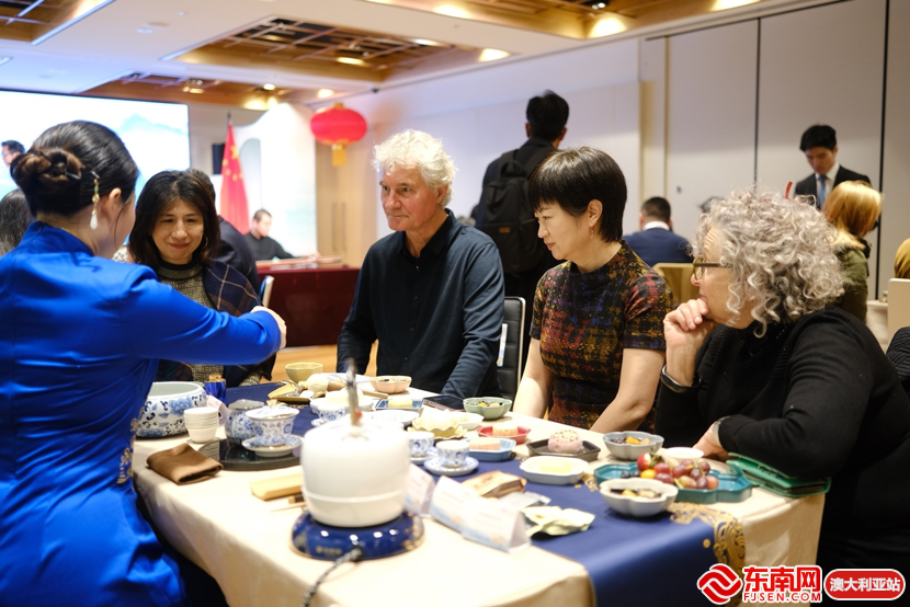 嘉賓欣賞茶藝表演。 東南網(wǎng)6月20日訊(本網(wǎng)特約記者 一禾)當(dāng)?shù)貢r間6月16日,“茶和天下·雅集”福茶品鑒專場活動在悉尼中國文化中心舉辦,開啟中國茶沉浸式體驗之旅。 中國駐悉尼大使銜總領(lǐng)事周立民、副總領(lǐng)事王春生、文化參贊王書羽、教育參贊林曉青,悉尼中國文化中心主任兼中國駐悉尼旅游辦事處主任肖夏勇,福建省文化和旅游廳副廳長肖長培,新州前懲教部長杰弗里·李,新州前上議員何沈慧霞,新州前上議員、悉尼市前副市長曾筱龍,新州威樂比市議員夏毓奇,澳中友協(xié)新州分會主席瑪格麗特·凱麗以及澳友好人士、新南威爾士大學(xué)師生代表等40多人出席了活動。肖夏勇、肖長培致歡迎辭。