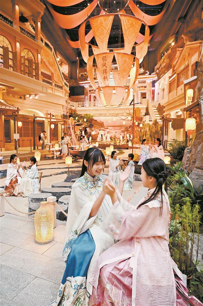 廈門六中合唱團(tuán)穿上古裝在“嶼見閩南”景區(qū)表演,為市民游客送祝福。 (記者 黃曉珍 攝)
