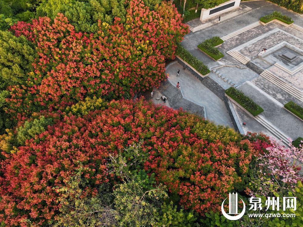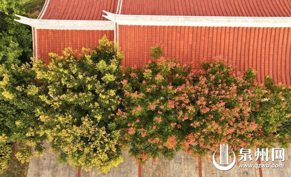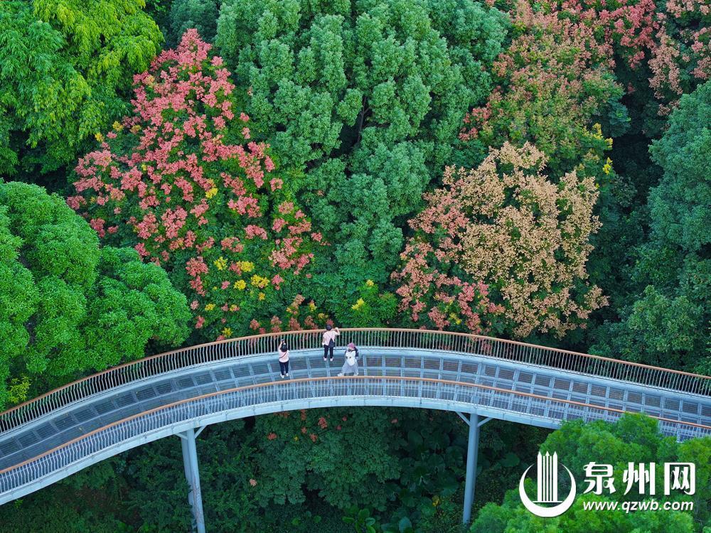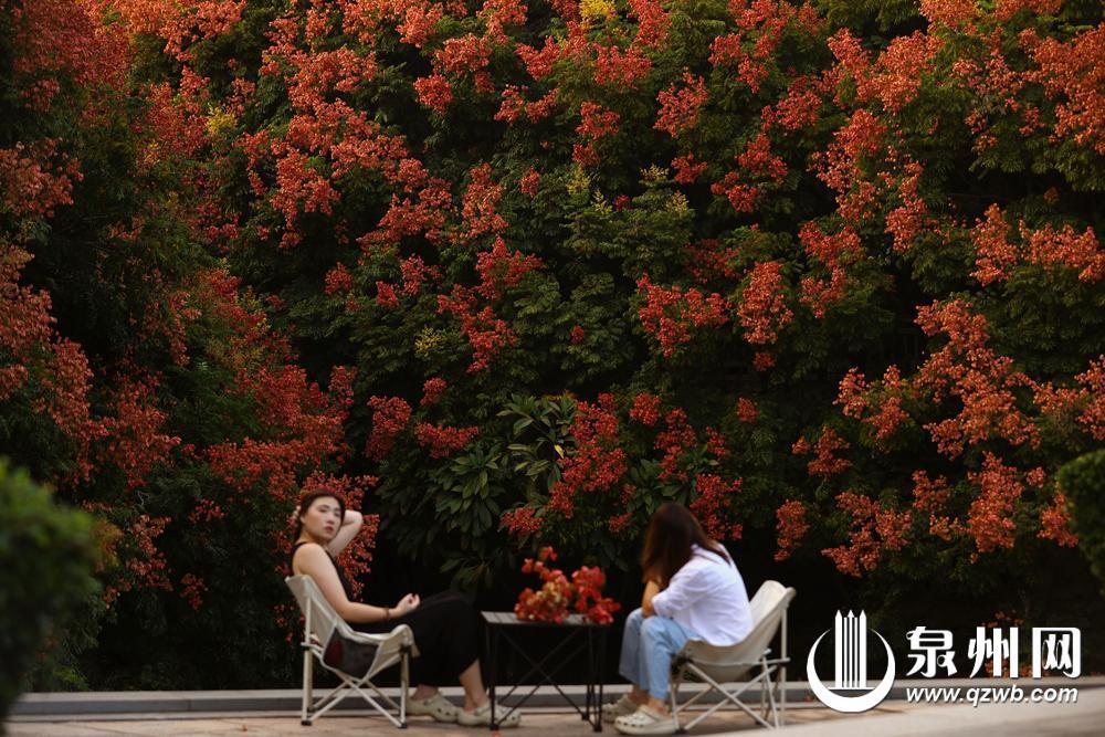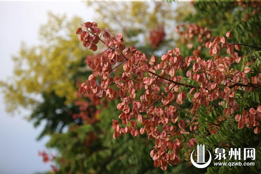 秋日里,泉州市區(qū)大坪山藏著一場不期而遇的色彩盛宴。近日,山上的五彩欒樹進入盛花期,細碎的黃花、鮮紅的果莢與翠綠的葉片交織,從山腳蔓延至山腰,宛如大自然打翻了調(diào)色盤,吸引不少市民專程登山打卡,朋友圈里滿是這片“秋日花?!钡纳碛?。 沿著大坪山健身步道向上走,未到山頂便被亮眼的色彩攔住腳步。近百株欒樹錯落分布在步道兩側(cè),樹干筆直挺拔,抬頭望去,樹冠像撐開的巨大花傘,細碎的金黃色小花綴滿枝頭,風一吹便簌簌落下,鋪成一層“黃金地毯”?;ㄖx后結(jié)出的三角狀果莢,初時是淡綠色,漸漸染上粉紅、朱紅,最終變成深褐色,遠遠望去,像掛在枝頭的小燈籠,又似一串串五彩鈴鐺,在陽光下泛著光澤。金黃的花簇、火紅的燈籠果與爛漫的粉霞交織碰撞,鋪展出層次豐富的秋日畫卷——抬眼望去,一層青綠、一層鵝黃、一層緋紅、一抹輕粉,它們錯落交織于山間,與山頂巍然矗立的鄭成功騎馬塑像遙相呼應(yīng),歷史的氣韻與自然的生機彼此交融。(東南早報融媒體記者 林福龍 莊麗祥 通訊員 許曉嵐 文/圖)