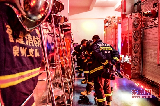 緊湊的警鈴聲響起,隊(duì)員們要在最短的時(shí)間內(nèi)穿好戰(zhàn)斗服出發(fā)。東南網(wǎng)記者 林婕 攝