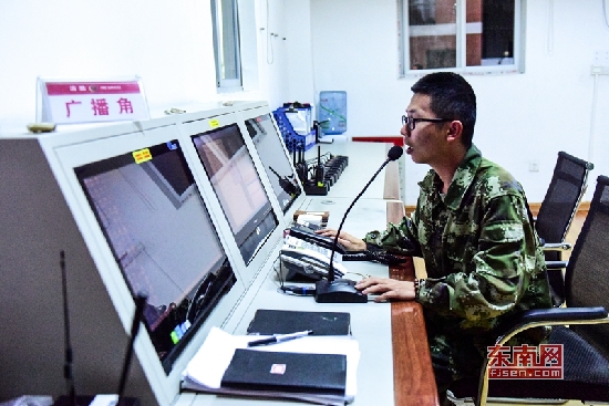 在中隊(duì)的廣播角,兩位后勤人員24小時(shí)輪崗,確保信息第一時(shí)間傳達(dá)到位。東南網(wǎng)記者 林婕 攝