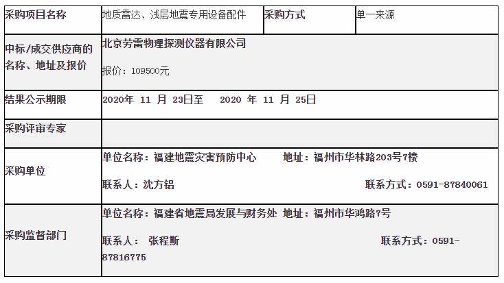地震災害預防中心2020年地質(zhì)雷達、淺層地震專用設備配件采購結果公告