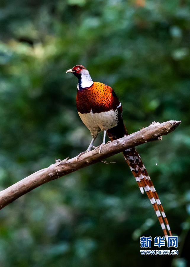 在永安市青水畬族鄉(xiāng)豐田村,一只白頸長(zhǎng)尾雉在樹干上休憩(11月20日攝)。新華社記者 梅永存 攝