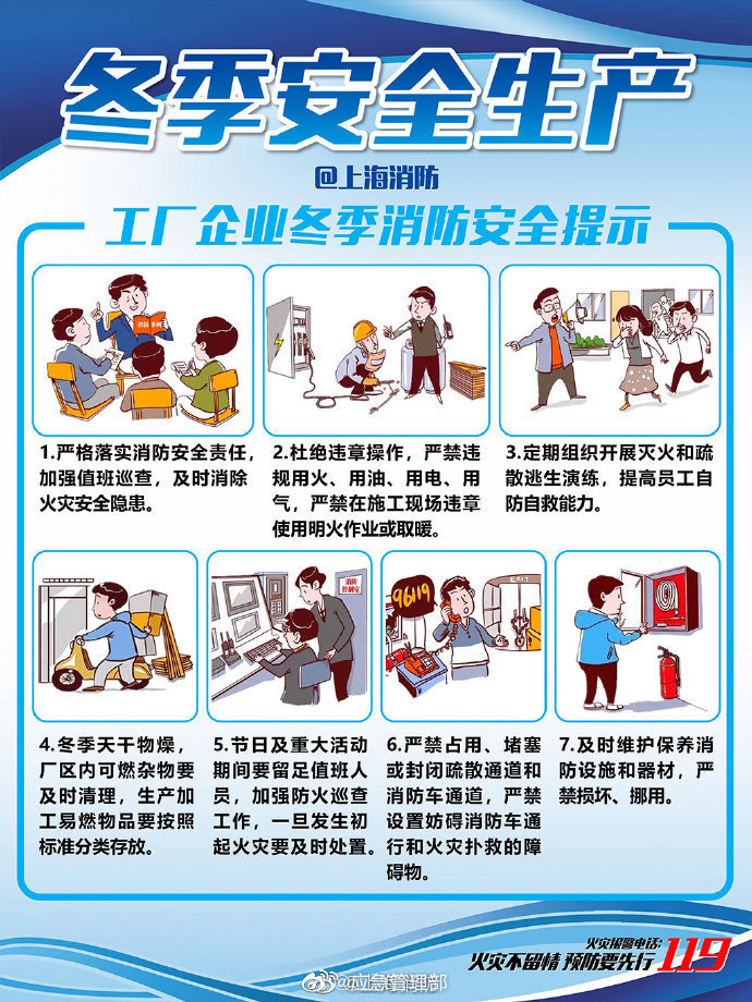 進入冬季,工廠企業(yè)安全生產(chǎn)至關重要,各個生產(chǎn)單位切記做好檢查工作,防患于未然。加強值班巡查、嚴禁在施工現(xiàn)場違章使用明火作業(yè)或取暖、定期組織開展滅火和疏散逃生演練……工廠企業(yè)冬季消防安全,這幾點要注意!