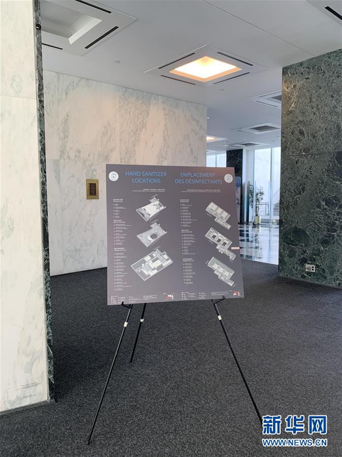7月20日,在位于紐約的聯(lián)合國總部,秘書處大樓入口附近豎立著一塊標(biāo)明消毒液擺放點(diǎn)的指示牌。 新華社記者 王建剛 攝