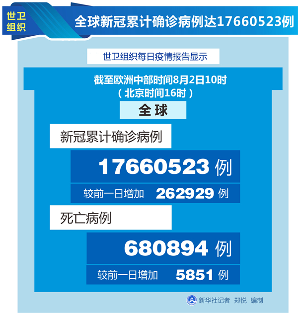 新華社日內(nèi)瓦8月2日電(記者劉曲)世界衛(wèi)生組織2日公布的最新數(shù)據(jù)顯示,全球新冠累計(jì)確診病例達(dá)17660523例。