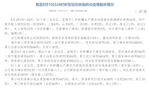 人民網(wǎng)北京8月11日電(董童)國(guó)家衛(wèi)生健康于今日在官網(wǎng)發(fā)布的《截至8月10日24時(shí)新型冠狀病毒肺炎疫情最新情況》(以下簡(jiǎn)稱(chēng)“情況”)提出,8月10日0—24時(shí),31個(gè)?。ㄗ灾螀^(qū)、直轄市)和新疆生產(chǎn)建設(shè)兵團(tuán)報(bào)告新增確診病例44例,其中境外輸入病例31例(陜西9例,上海8例,山東6例,廣東3例,甘肅2例,河北1例,黑龍江1例,浙江1例),本土病例13例(均在新疆);無(wú)新增死亡病例;新增疑似病例2例,均為境外輸入病例(上海1例,福建1例)。當(dāng)日新增治愈出院病例52例,解除醫(yī)學(xué)觀察的密切接觸者1729人,重癥病例較前一日增加3例。