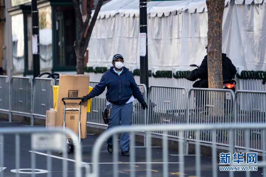 1月18日,在美國華盛頓,一名戴口罩的工作人員為總統(tǒng)就職典禮作準備。