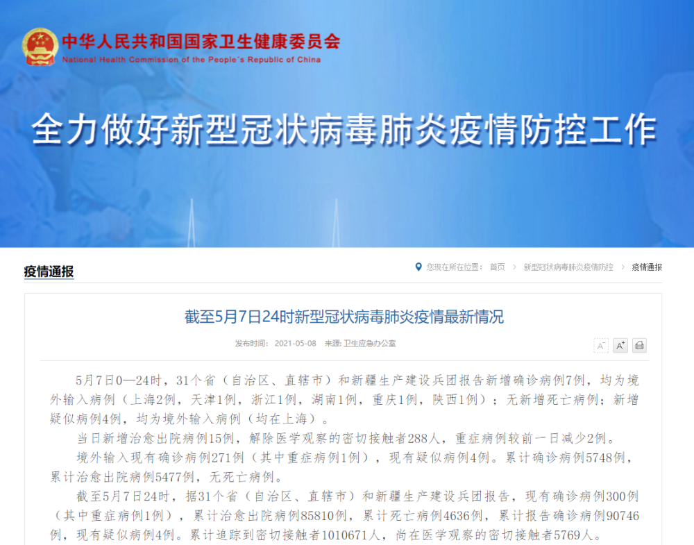 截至5月7日24時(shí)新型冠狀病毒肺炎疫情最新情況 5月7日0—24時(shí),31個(gè)省(自治區(qū)、直轄市)和新疆生產(chǎn)建設(shè)兵團(tuán)報(bào)告新增確診病例7例,均為境外輸入病例(上海2例,天津1例,浙江1例,湖南1例,重慶1例,陜西1例);無(wú)新增死亡病例;新增疑似病例4例,均為境外輸入病例(均在上海)。 當(dāng)日新增治愈出院病例15例,解除醫(yī)學(xué)觀察的密切接觸者288人,重癥病例較前一日減少2例。 境外輸入現(xiàn)有確診病例271例(其中重癥病例1例),現(xiàn)有疑似病例4例。累計(jì)確診病例5748例,累計(jì)治愈出院病例5477例,無(wú)死亡病例。 截至5月7日24時(shí),據(jù)31個(gè)?。ㄗ灾螀^(qū)、直轄市)和新疆生產(chǎn)建設(shè)兵團(tuán)報(bào)告,現(xiàn)有確診病例300例(其中重癥病例1例),累計(jì)治愈出院病例85810例,累計(jì)死亡病例4636例,累計(jì)報(bào)告確診病例90746例,現(xiàn)有疑似病例4例。累計(jì)追蹤到密切接觸者1010671人,尚在醫(yī)學(xué)觀察的密切接觸者5769人。 31個(gè)省(自治區(qū)、直轄市)和新疆生產(chǎn)建設(shè)兵團(tuán)報(bào)告新增無(wú)癥狀感染者8例(均為境外輸入);當(dāng)日轉(zhuǎn)為確診病例2例(均為境外輸入);當(dāng)日解除醫(yī)學(xué)觀察11例(均為境外輸入);尚在醫(yī)學(xué)觀察的無(wú)癥狀感染者313例(境外輸入306例)。 累計(jì)收到港澳臺(tái)地區(qū)通報(bào)確診病例13028例。其中,香港特別行政區(qū)11801例(出院11473例,死亡210例),澳門(mén)特別行政區(qū)49例(出院49例),臺(tái)灣地區(qū)1178例(出院1077例,死亡12例)。