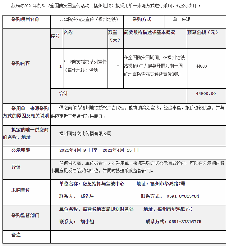 應(yīng)急指揮與宣教中心5.12防災(zāi)減災(zāi)宣傳(福州地鐵)采購公示
