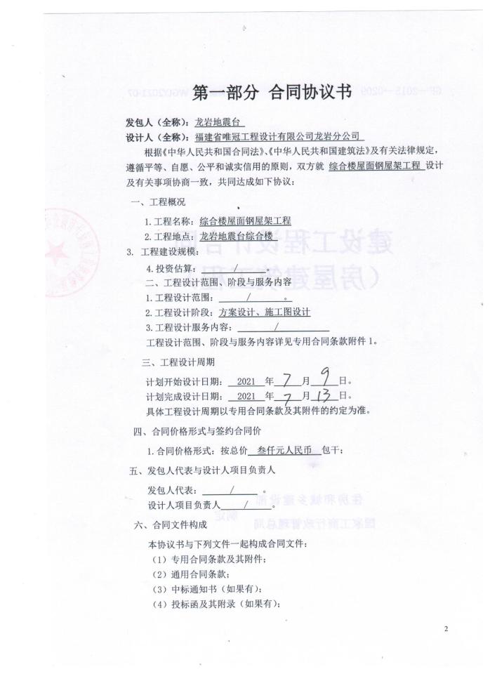 龍巖地震臺綜合樓鋼屋架工程設(shè)計合同公示