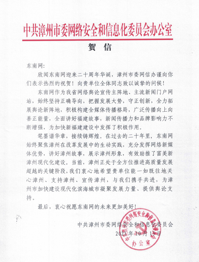 中共漳州市委網(wǎng)絡(luò)安全和信息化委員會辦公室賀信