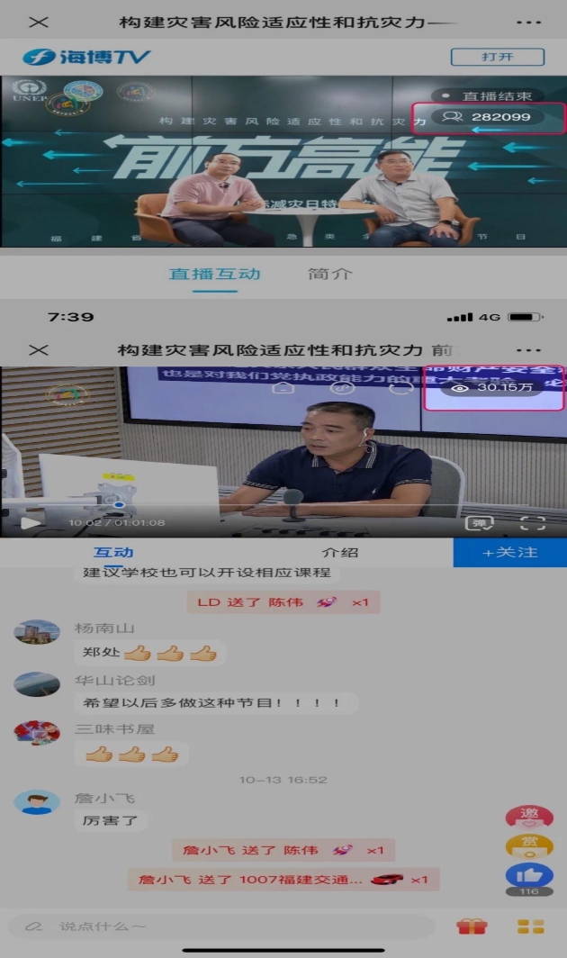 10月13日是第32個(gè)國際減災(zāi)日,今年的主題是“構(gòu)建災(zāi)害風(fēng)險(xiǎn)適應(yīng)性和抗災(zāi)力”。在今年的國際減災(zāi)日(2021年10月13日)中,福建省應(yīng)急管理廳與福建交通應(yīng)急廣播共同策劃,推出《前方高能》國際減災(zāi)日直播訪談特別節(jié)目。本次參加訪談的是福建省應(yīng)急管理廳風(fēng)險(xiǎn)監(jiān)測和綜合減災(zāi)處鄭成捷處長、福建省減災(zāi)中心周翔副主任和福建師范大學(xué)地理研究所高路教授,他們一同為觀眾朋友們講解了全國第一次自然災(zāi)害綜合風(fēng)險(xiǎn)普查的目的和做法,以及構(gòu)建災(zāi)害風(fēng)險(xiǎn)適應(yīng)性和抗災(zāi)力的多項(xiàng)舉措。 在訪談直播中,鄭成捷處長強(qiáng)調(diào)了今年國際減災(zāi)日的主題“合作協(xié)同,多管齊下”,呼吁防災(zāi)減災(zāi)救災(zāi)工作要政府、社會(huì)、公民等各方力量廣泛參與,形成合力。周翔副主任特別介紹了本次普查是新中國成立以來第一次開展的全國自然災(zāi)害綜合風(fēng)險(xiǎn)普查,包括致災(zāi)因子調(diào)查、承災(zāi)體調(diào)查、歷史災(zāi)害信息調(diào)查和區(qū)域綜合減災(zāi)能力調(diào)查等,普查涉及領(lǐng)域廣、綜合性強(qiáng)、技術(shù)要求高、實(shí)施難度大。高路教授表示,第一次自然災(zāi)害綜合風(fēng)險(xiǎn)普查不僅可以摸清風(fēng)險(xiǎn)隱患底數(shù)、客觀認(rèn)知風(fēng)險(xiǎn)水平,還可以為長遠(yuǎn)的應(yīng)急預(yù)案、防災(zāi)規(guī)劃等工作提供可靠的科技支撐,真正做到智慧減災(zāi)。 本次《前方高能》國際減災(zāi)日直播訪談特別節(jié)目在微博、視頻號、抖音、直播海峽、海博TV等多平臺(tái)同步直播,全網(wǎng)播放量超過60萬,取得了良好的社會(huì)反響。