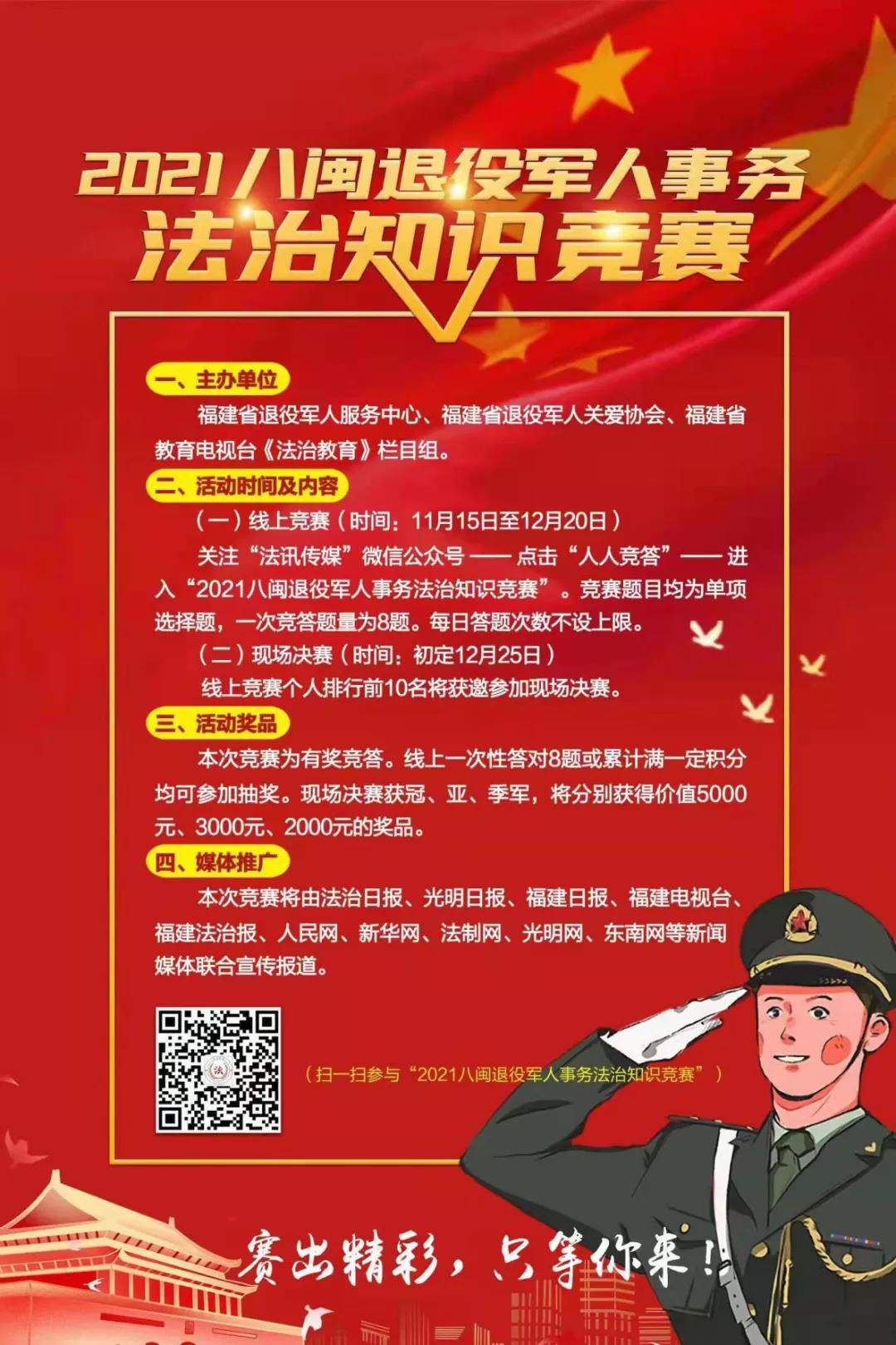 八閩退役軍人事務(wù)法治知識競賽開始啦!11月15日-12月20日為線上競賽,每日答題次數(shù)不設(shè)上線,每次8題.快來參與吧!