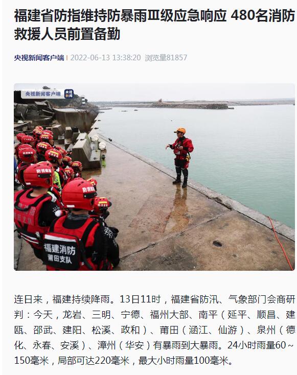 [央視新聞客戶端]福建省防指維持防暴雨Ⅲ級(jí)應(yīng)急響應(yīng) 480名消防救援人員前置備勤