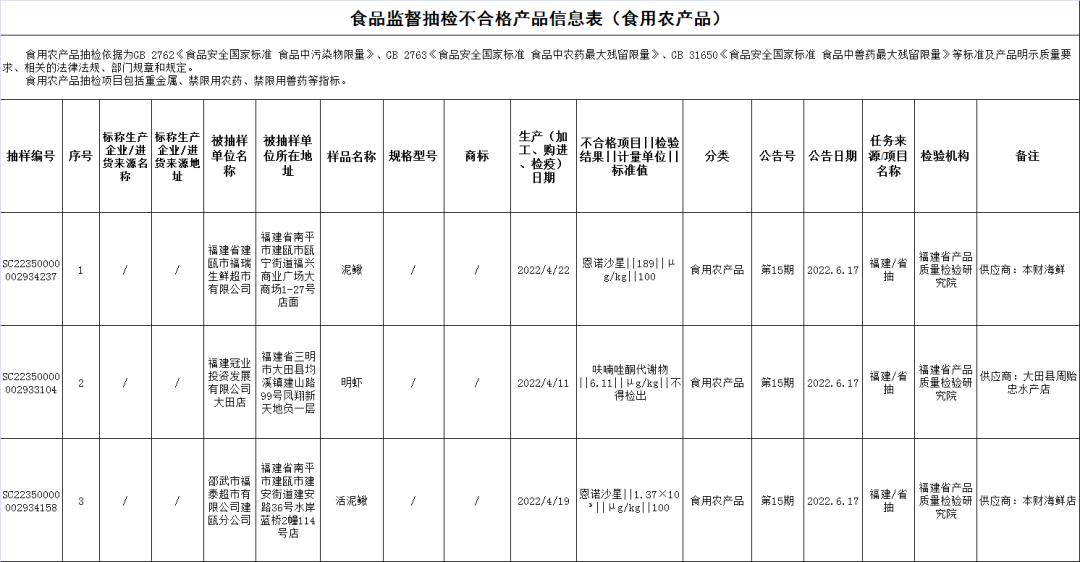 獸藥殘留問題 福建省建甌市福瑞生鮮超市有限公司銷售的泥鰍(購進日期為2022年4月22日),恩諾沙星不合格,檢驗機構(gòu)為福建省產(chǎn)品質(zhì)量檢驗研究院; 福建冠業(yè)投資發(fā)展有限公司大田店銷售的明蝦(購進日期為2022年4月11日),呋喃唑酮代謝物不合格,檢驗機構(gòu)為福建省產(chǎn)品質(zhì)量檢驗研究院; 邵武市福泰超市有限公司建甌分公司銷售的活泥鰍(購進日期為2022年4月19日),恩諾沙星不合格,檢驗機構(gòu)為福建省產(chǎn)品質(zhì)量檢驗研究院。