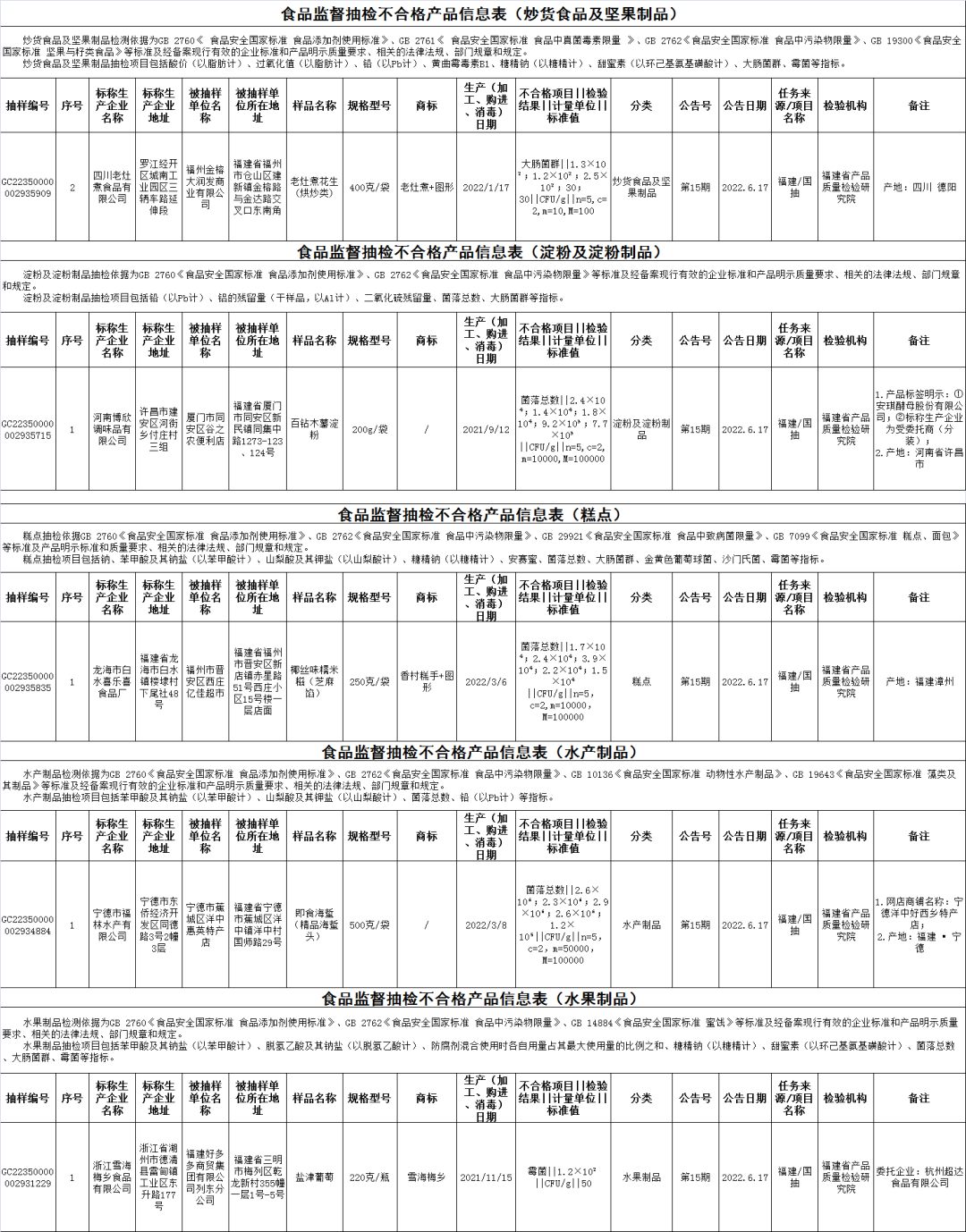 微生物污染問題 四川老灶煮食品有限公司2022年1月17日生產(chǎn)的老灶煮花生(烘炒類),大腸菌群不合格,銷售單位為福州金榕大潤發(fā)商業(yè)有限公司,檢驗機構(gòu)為福建省產(chǎn)品質(zhì)量檢驗研究院; 河南博欣調(diào)味品有限公司2021年9月12日生產(chǎn)的百鉆木薯淀粉,菌落總數(shù)不合格,銷售單位為廈門市同安區(qū)谷之農(nóng)便利店,檢驗機構(gòu)為福建省產(chǎn)品質(zhì)量檢驗研究院; 龍海市白水喜樂喜食品廠2022年3月6日生產(chǎn)的椰絲味糯米糍(芝麻餡),菌落總數(shù)不合格,銷售單位為福州市晉安區(qū)西莊億佳超市,檢驗機構(gòu)為福建省產(chǎn)品質(zhì)量檢驗研究院; 寧德市福林水產(chǎn)有限公司2022年3月8日生產(chǎn)的即食海蜇(精品海蜇頭),菌落總數(shù)不合格,銷售單位為寧德市蕉城區(qū)洋中惠英特產(chǎn)店,檢驗機構(gòu)為福建省產(chǎn)品質(zhì)量檢驗研究院; 浙江雪海梅鄉(xiāng)食品有限公司2021年11月15日生產(chǎn)的鹽津葡萄,霉菌不合格,銷售單位為福建好多多商貿(mào)集團有限公司列東分公司,檢驗機構(gòu)為福建省產(chǎn)品質(zhì)量檢驗研究院。