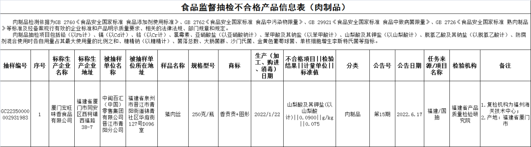 食品添加劑問題 廈門宏旺味香食品有限公司2022年1月22日生產(chǎn)的豬肉絲,山梨酸及其鉀鹽(以山梨酸計)不合格,銷售單位為中閩百匯(中國)零售集團有限公司晉江市青陽分公司,初檢機構(gòu)為福建省產(chǎn)品質(zhì)量檢驗研究院,復(fù)檢機構(gòu)為福州海關(guān)技術(shù)中心。