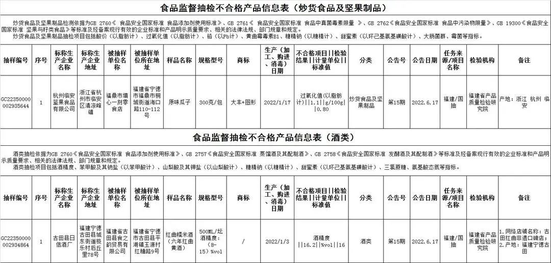 新一期的食品安全抽檢 新鮮出爐! 注意! 這些食品抽檢不合格 千萬別買哦 第15期公告的監(jiān)督抽檢信息涉及27大類食品911批次,包括:糧食加工品、食用油(含油脂及其制品)、調(diào)味品、肉制品、乳制品、飲料、方便食品、餅干、罐頭、冷凍飲品、速凍食品、薯類和膨化食品、糖果制品、茶葉及相關(guān)制品、酒類、蔬菜制品、水果制品、炒貨食品及堅果制品、蛋制品、食糖、水產(chǎn)制品、淀粉及淀粉制品、糕點、豆制品、餐飲食品、食品添加劑、食用農(nóng)產(chǎn)品。合格900批次,不合格11批次。涉及質(zhì)量指標問題、微生物污染問題、食品添加劑問題、獸藥殘留問題。 質(zhì)量指標問題 杭州臨安藍果食品有限公司2022年1月17日生產(chǎn)的原味瓜子,過氧化值(以脂肪計)不合格,銷售單位為福鼎市填心一刻零食店,檢驗機構(gòu)為福建省產(chǎn)品質(zhì)量檢驗研究院; 古田縣日信酒廠2022年1月3日生產(chǎn)的紅曲糯米酒(六年紅曲黃酒),酒精度不合格,銷售單位為福建省古田縣食之韻貿(mào)易有限公司,檢驗機構(gòu)為福建省產(chǎn)品質(zhì)量檢驗研究院。