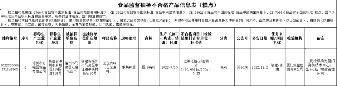 質(zhì)量指標問題 永嘉利(福建)食品有限公司2022年4月2日生產(chǎn)的美味來敲門(咸蛋黃味韌性餅干),過氧化值(以脂肪計)不合格,銷售單位為福建省邵武市華興嘉園超市有限公司,初檢機構為福建賽福食品檢測研究所有限公司,復檢機構為廈門海關技術中心; 龍海市漳龍食品有限公司2022年8月6日生產(chǎn)的魚皮花生(原味),過氧化值(以脂肪計)不合格,銷售單位為武平縣美杏食品店,初檢機構為福建省產(chǎn)品質(zhì)量檢驗研究院,復檢機構為福建中檢華日食品安全檢測有限公司; 福建漳州錦昌食品有限公司2022年8月17日生產(chǎn)的咸香糕,過氧化值(以脂肪計)不合格,銷售單位為詔安縣云寶食品店,初檢機構為廈門海關技術中心,復檢機構為福建省產(chǎn)品質(zhì)量檢驗研究院; 漳州市好銘園食品有限公司2022年7月10日生產(chǎn)的芝芝有味(白芝麻味),過氧化值(以脂肪計)不合格,銷售單位為福州市馬尾區(qū)匯佰樂超市,初檢機構為廈門泓益檢測有限公司,復檢機構為廈門海關技術中心; 漳州市佳辰糧油工貿(mào)有限公司2022年6月18日生產(chǎn)的一級成品大豆油,酸價(KOH)不合格,銷售單位為廈門世紀名流商貿(mào)有限公司,初檢機構為廈門泓益檢測有限公司,復檢機構為廈門海關技術中心。
