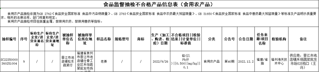 農(nóng)獸藥殘留問題 古田縣商業(yè)大世界農(nóng)貿(mào)市場魏錫旺銷售的長豆(購進日期為2022年8月24日),滅蠅胺不合格,初檢機構為福建省產(chǎn)品質(zhì)量檢驗研究院,復檢機構為福建中檢華日食品安全檢測有限公司; 福州睿德餐飲管理有限公司銷售的香蕉(購進日期為2022年9月2日),吡蟲啉不合格,初檢機構為福建省產(chǎn)品質(zhì)量檢驗研究院,復檢機構為福州海關技術中心; 福建中馳至膳食品有限公司銷售的香蕉(購進日期為2022年9月4日),噻蟲嗪不合格,初檢機構為福建省產(chǎn)品質(zhì)量檢驗研究院,復檢機構為福州海關技術中心; 廈門夏商營養(yǎng)餐有限公司銷售的姜(購進日期為2022年9月15日),噻蟲胺不合格,檢驗機構為福建省產(chǎn)品質(zhì)量檢驗研究院; 沃爾瑪(福建)商業(yè)零售有限公司福州浦上大道分店銷售的包裝油麥菜(上市日期為2022年9月4日),腈菌唑不合格,初檢機構為福建賽福食品檢測研究所有限公司,復檢機構為廈門市產(chǎn)品質(zhì)量監(jiān)督檢驗院; 泉州市洛江萬安友誼自選商場銷售的韭菜(購進日期為2022年9月27日),毒死蜱不合格、腐霉利不合格,檢驗機構為福州海關技術中心; 福建好多多商貿(mào)集團有限公司三明城市廣場分公司銷售的活牛蛙(購進日期為2022年9月19日),呋喃唑酮代謝物不合格,檢驗機構為福州海關技術中心; 福建冠業(yè)投資發(fā)展有限公司南平萬達廣場店銷售的冰鮮鱸魚(海水魚)(購進日期為2022年9月21日),呋喃唑酮代謝物不合格,檢驗機構為廈門泓益檢測有限公司; 福建冠業(yè)投資發(fā)展有限公司南平萬達廣場店銷售的冰鮮淡水瓜(淡水魚)(購進日期為2022年9月29日),恩諾沙星不合格,檢驗機構為廈門泓益檢測有限公司; 福清市佳選超市有限公司銷售的豇豆(購進日期為2022年8月29日),甲胺磷不合格、克百威不合格、乙酰甲胺磷不合格,初檢機構為福州海關技術中心,復檢機構為福建省產(chǎn)品質(zhì)量檢驗研究院; 莆田市秀嶼區(qū)東莊鵬成食雜店銷售的菠菜(購進日期為2022年9月21日),毒死蜱不合格,檢驗機構為福州海關技術中心; 福建中禾食品科技有限責任公司銷售的生姜(購進日期為2022年9月16日),噻蟲胺不合格,檢驗機構為福建省產(chǎn)品質(zhì)量檢驗研究院; 廈門夏商百貨集團三明有限公司三元店銷售的活牛蛙(購進日期為2022年9月21日),呋喃唑酮代謝物不合格,檢驗機構為廈門泓益檢測有限公司; 廈門夏商百貨集團三明有限公司三元店銷售的菠菜(購進日期為2022年9月22日),毒死蜱不合格,檢驗機構為廈門泓益檢測有限公司; 廈門潤澤夏福貿(mào)易有限公司銷售的長豆(豇豆)(購進日期為2022年9月28日),水胺硫磷不合格、倍硫磷不合格、甲基異柳磷不合格,檢驗機構為福建賽福食品檢測研究所有限公司。