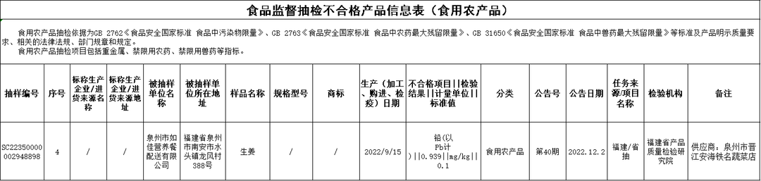 重金屬污染問題 永輝超市有限公司漳州萬科里店銷售的田趣官塢小海帶結(購進日期為2022年8月19日),鉛(以Pb計)不合格,初檢機構為福建省產(chǎn)品質(zhì)量檢驗研究院,復檢機構為福州海關技術中心。 福建宏華央廚餐飲服務有限公司銷售的生姜(購進日期為2022年9月6日),鉛(以Pb計)不合格,初檢機構為福建省產(chǎn)品質(zhì)量檢驗研究院,復檢機構為廈門市產(chǎn)品質(zhì)量監(jiān)督檢驗院; 泉州市如佳營養(yǎng)餐配送有限公司銷售的生姜(購進日期為2022年9月15日),鉛(以Pb計)不合格,檢驗機構為福建省產(chǎn)品質(zhì)量檢驗研究院; 永輝超市股份有限公司福建福州公園道超市銷售的公正蟹(活)(購進日期為2022年8月31日),鎘(以Cd計)不合格,初檢機構為南京海關動植物與食品檢測中心,復檢機構為福建省產(chǎn)品質(zhì)量檢驗研究院; 晉江市池店鎮(zhèn)松東蔬菜行銷售的老姜(購進日期為2022年9月26日),鉛(以Pb計)不合格,檢驗機構為福州海關技術中心; 廈門夏商百貨集團南平有限公司建甌時代店銷售的茄子(購進日期為2022年10月1日),鎘(以Cd計)不合格,檢驗機構為廈門泓益檢測有限公司; 福建省建甌市福瑞生鮮超市有限公司銷售的青絲茄(購進日期為2022年9月30日),鎘(以Cd計)不合格,檢驗機構為廈門泓益檢測有限公司; 晉江潤德商業(yè)有限公司銷售的老姜(購進日期為2022年9月18日),鉛(以Pb計)不合格,檢驗機構為福州海關技術中心。