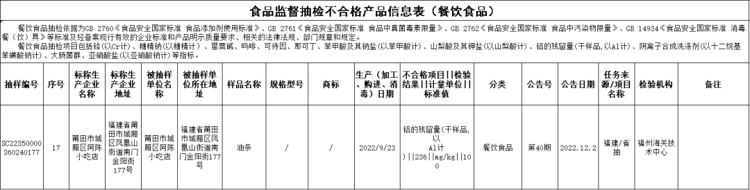 俗話說 人是鐵,飯是鋼 一頓不吃餓得慌 守護老百姓“舌尖上的安全” 我們一直在路上 最新一期食品抽檢結果 新!鮮!出!爐! 快來看看 第40期公告的監(jiān)督抽檢信息涉及22大類食品1566批次,包括:糧食加工品、食用油(含油脂及其制品)、調(diào)味品、肉制品、乳制品、飲料、方便食品、餅干、冷凍飲品、速凍食品、薯類和膨化食品、糖果制品、茶葉及相關制品、酒類、水果制品、炒貨食品及堅果制品、水產(chǎn)制品、糕點、豆制品、保健食品、餐飲食品(含餐飲具)、食用農(nóng)產(chǎn)品。合格1514批次,不合格52批次。涉及食品添加劑問題、微生物污染問題、重金屬污染問題、農(nóng)獸藥殘留問題、質(zhì)量指標問題、其他污染問題。 食品添加劑問題 漳平市阿川小吃店的油條(加工日期為2022年10月5日),鋁的殘留量(干樣品,以Al計)不合格,檢驗機構為福州海關技術中心; 晉江市青陽晉仙小吃店的油條(加工日期為2022年10月5日),鋁的殘留量(干樣品,以Al計)不合格,檢驗機構為廈門海關技術中心; 廈門市同安區(qū)清渝小吃店的油條(加工日期為2022年9月27日),鋁的殘留量(干樣品,以Al計)不合格,檢驗機構為福建省產(chǎn)品質(zhì)量檢驗研究院; 莆田市城廂區(qū)阿陳小吃店的油條(加工日期為2022年9月23日),鋁的殘留量(干樣品,以Al計)不合格,檢驗機構為福州海關技術中心; 福建宇之潤食品有限公司2022年7月5日生產(chǎn)的紫薯燒小面包(紫薯味),苯甲酸及其鈉鹽(以苯甲酸計)不合格,銷售單位為廈門市同安區(qū)誼品陽光便利店,初檢機構為福州海關技術中心,復檢機構為廈門市產(chǎn)品質(zhì)量監(jiān)督檢驗院; 漳州市旺豐香食品有限公司2022年9月3日生產(chǎn)的水果小卷蛋糕,脫氫乙酸及其鈉鹽(以脫氫乙酸計)不合格、防腐劑混合使用時各自用量占其最大使用量的比例之和不合格,銷售單位為福州市晉安區(qū)興福興超市有限公司,檢驗機構為福建賽福食品檢測研究所有限公司; 龍海市正豐食品有限公司2022年9月7日生產(chǎn)的鳳凰蛋酥(原味),丙二醇不合格,銷售單位為泰寧縣秀娟便利店,檢驗機構為福州海關技術中心。
