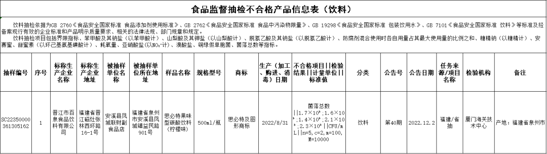 微生物污染問題 莆田市涵江區(qū)京味餐館的白色花紋碗(消毒日期為2022年9月26日),大腸菌群不合格,檢驗機構為福建省產(chǎn)品質(zhì)量檢驗研究院; 福清市音西歡喜餐飲店的圓盤(消毒日期為2022年9月28日),大腸菌群不合格,檢驗機構為福建省產(chǎn)品質(zhì)量檢驗研究院; 福清市音西歡喜餐飲店的三角盤(消毒日期為2022年9月28日),大腸菌群不合格,檢驗機構為福建省產(chǎn)品質(zhì)量檢驗研究院; 廈門麥初食品有限公司2022年9月10日生產(chǎn)的麻棗(糕點),霉菌不合格,銷售單位為廈門市湖里區(qū)秋良泓干貨商行,檢驗機構為福州海關技術中心; 晉江市百泉食品飲料有限公司2022年8月31日生產(chǎn)的思必特果味型碳酸飲料(檸檬味),菌落總數(shù)不合格,銷售單位為安溪縣鳳城聯(lián)財副食品店,檢驗機構為廈門海關技術中心。