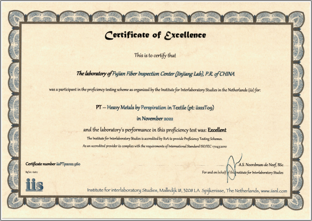 近日,荷蘭IIS發(fā)布2022年“紡織品中重金屬含量測試(pt:iis22T09)”能力驗證結(jié)果,福建省纖檢中心福州、晉江兩地實驗室均獲得“滿意”結(jié)果。