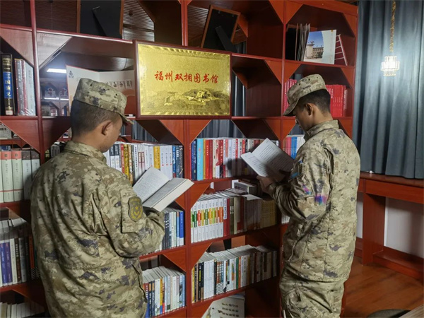 部隊官兵在“福州雙擁圖書館”閱讀 該部營區(qū)地處年楚河流域,海拔4000米之上,常年高寒缺氧,屬三類艱苦邊遠地區(qū)。戍邊官兵在條件十分艱苦的情況下,堅守雪域邊疆,守衛(wèi)祖國前哨。福州市切實發(fā)揮全國雙擁模范城榜樣示范作用,投入230萬元建設(shè)提升部隊文體設(shè)施。2023年,為進一步服務官兵所需,豐富官兵精神文化生活,與部隊在高原營區(qū)共建圖書館。該圖書館的正式掛牌,標志著全國海拔最高雙擁圖書館暨軍營郵政集郵文化展示館——“福州雙擁圖書館”的正式投用,也標志了福州“情系邊海防”擁軍優(yōu)屬系列活動一項重要工作的順利完成。