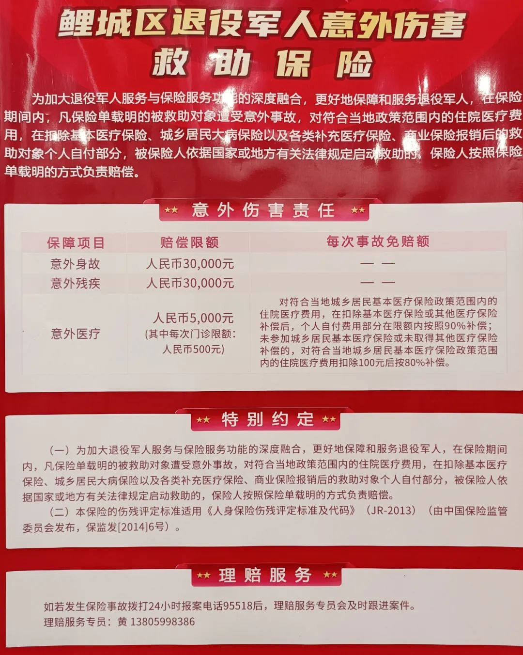 為提升鯉城區(qū)退役軍人意外傷害救助保險項目的服務(wù)質(zhì)效,儀式上,人保財險鯉城支公司組織鯉城區(qū)退役軍人服務(wù)中心及各街道退役軍人服務(wù)站負責人、公司項目骨干,針對保險責任方案、理賠釋義及服務(wù)進行業(yè)務(wù)培訓(xùn)。接下來,將通過覆蓋鯉城區(qū)退役軍人服務(wù)站的科普e站、微信公眾號、門型展架及宣傳彩頁等媒介進行政策宣傳,進一步提高廣大退役軍人的知曉度和辦理滿意率。 作為鯉城區(qū)2023年為民辦實事項目的第二十四件實事,退役軍人意外傷害救助保險保費每人每年30元,鯉城區(qū)每年共投入30萬元。人身意外傷害保險項目涵蓋意外身故、意外殘疾、意外醫(yī)療3類。退役軍人出現(xiàn)意外傷害時,可到縣級以上醫(yī)院門診、住院治療,按流程申請理賠,按照不同類型可以申請到5000-30000元的賠償金額。