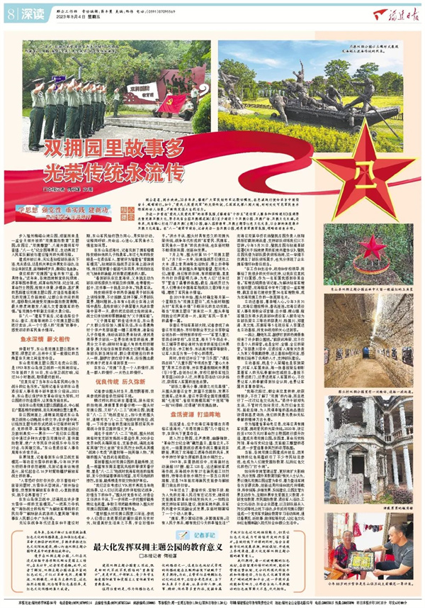 核心提示 閩山蒼蒼,閩水泱泱。30多年來,福建廣大軍民始終牢記殷切囑托,在忠誠踐行使命宗旨中接續(xù)奮斗、砥礪前行。如今,“愛我人民愛我軍”的光榮傳統(tǒng),已深深扎根八閩大地,時時處處可見軍民魚水情深的動人場景,不斷煥發(fā)強大生機活力。 為進一步營造“愛我人民愛我軍”的濃厚氛圍,《福建省“十四五”退役軍人服務(wù)和保障規(guī)劃》強調(diào)要注重發(fā)展雙擁文化,要求我省全國雙擁模范城(縣)至少建設(shè)1個雙擁公園、雙擁廣場、雙擁文化長廊。近年來,我省精心打造77座雙擁(主題)公園,融入國防教育、雙擁主題等紅色文化元素,以全新的角度展示雙擁文化底蘊。在“八一”建軍節(jié)前后,走訪一些雙擁公園,感受崇軍擁軍氛圍,領(lǐng)略濃濃魚水情。