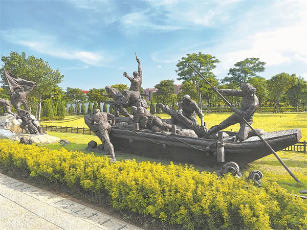 月港雙擁公園以立雕形式展現(xiàn)龍海船工渡海作戰(zhàn)的風采。 作為福建省革命老區(qū)縣,龍海區(qū)具有擁軍優(yōu)屬、擁政愛民的光榮傳統(tǒng)。2020年,該區(qū)投資6700萬元對革命烈士陵園進行提升改造,建成月港雙擁公園。在園里,革命歷史陳列館、革命歷史紀念墻、支前船工雕塑的落成,進一步營造尊崇英烈的濃厚氛圍。 當前,各地雙擁公園建成開放后,因其獨特的紅色底蘊吸引了不少市民駐足參觀,也成為人們接受國防教育、弘揚紅色文化的熱門“打卡地”。 如何科學地管理運營,更好地擴大影響力,充分發(fā)揮、提升其教育效能?有關(guān)人士認為,要以強化雙擁公園運營為牽引,著力盤活軍地各方資源優(yōu)勢,創(chuàng)新運用網(wǎng)絡(luò)和現(xiàn)代傳媒載體,科學統(tǒng)籌、多維發(fā)展、系統(tǒng)建設(shè),公園主管方要主動作為,定期開展學生愛國主義教育、干部黨性教育、市民國防教育、退役軍人活動、工會文化活動、社會企業(yè)團建,以及部隊新兵入列儀式等線上線下活動,多形式將雙擁公園打造成一個黨史軍史融合教育學習活動陣地,通過看展覽、聽故事、做體驗等形式,讓紅色文化和紅色精神融入現(xiàn)代社會和群眾生活中。 |