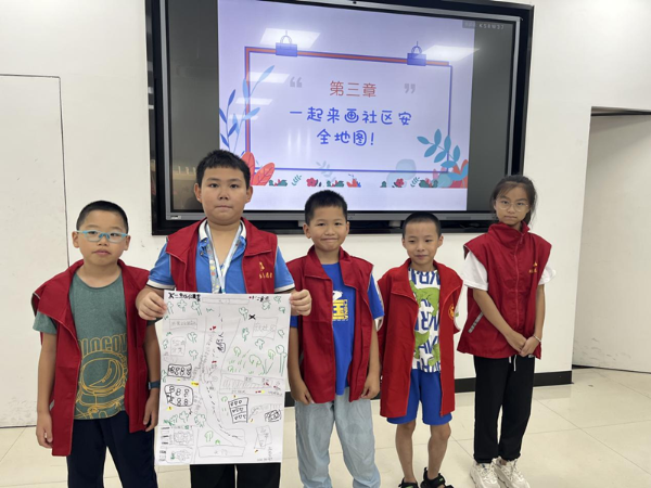 四、我是小小安全員 海容社工從消防安全、人身安全和基礎設施維修管理的情況三方面介紹了社區(qū)中常見的安全隱患,將營員們分為三組,讓他們在社工們的陪伴下自主探索社區(qū)內(nèi)存在的安全隱患,仔細地用紙和筆記錄下自己的觀察和發(fā)現(xiàn),繪制社區(qū)安全隱患地圖,分組上臺介紹自己的成果。