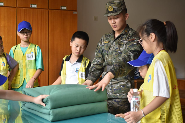 二、軍營生活初體驗 為了讓營員們體驗軍隊的訓練生活,教官們將營員們分成三組,傳授給他們完成標準的立正、稍息、齊步走動作的要訣。教官們帶領營員們來到宿舍,手把手教他們?nèi)绾伟驯蛔盈B成方方正正的“豆腐塊”,更鼓勵他們立鴻鵠志、做奮斗者,在精進學業(yè)的同時不忘鍛煉身體,爭取有朝一日參軍入伍,為祖國的強軍建設貢獻青春力量。