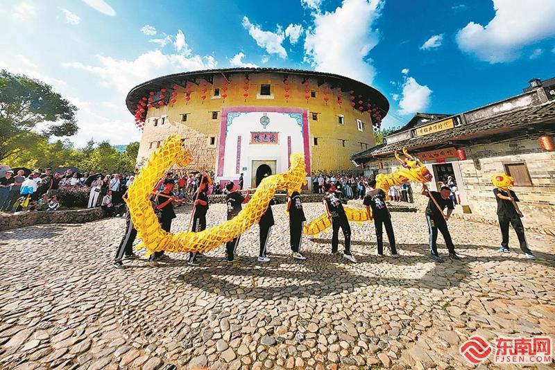 中秋國慶假期,在福建土樓(南靖)景區(qū),表演者舞龍舞獅迎接游客。福建日報記者 林輝通 訊員 余祥龍 李小琴 攝