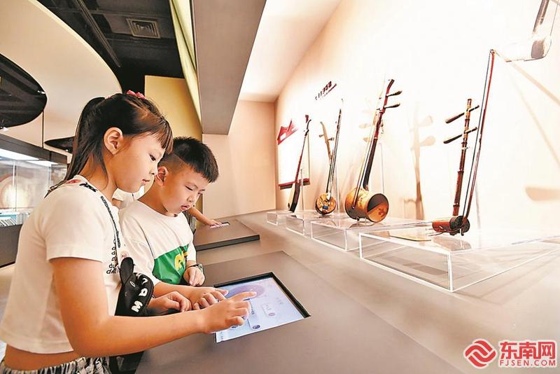 中秋國慶假期,在泉州非物質文化遺產館里,小游客通過觸摸屏了解當地非遺北管樂器知識。福建日報記者 林輝 攝