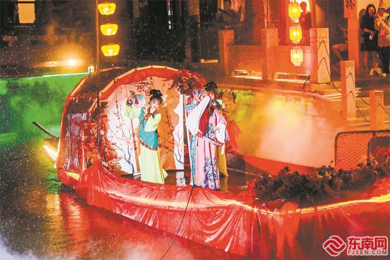 中秋國慶假期,漳州龍?!昂蟾勰耆A·非遺奇妙夜”沉浸式夜游向游客展現(xiàn)了后港古街的歷史風貌。福建日報記者 郭斌 攝