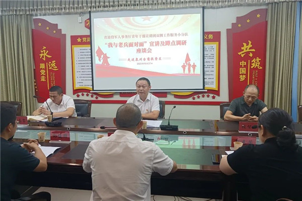 開展雙擁工作座談 最后,調(diào)研組一行在洛陽鎮(zhèn)人民政府會議室互動交流并聽取我區(qū)雙擁工作相關(guān)情況匯報。一是雙擁亮點特色突出?!拔遗c老兵面對面”宣講實踐活動、“軍人退役一件事”兩項工作任務(wù)被省、市納入縣(市、區(qū))級試點宣傳推廣。二是擁軍支前持續(xù)加強。開展“軍民情”共建活動,深化“雙擁在基層”活動,加大隨軍家屬就業(yè)扶持力度。三是保障體系不斷完善。組織召開區(qū)、鎮(zhèn)退役軍人事務(wù)工作會議,在各級退役軍人服務(wù)中心(站)設(shè)置窗口,設(shè)立巡回辦案點。四是政策落實持續(xù)推進(jìn)。落實撫恤優(yōu)待政策,扎實推進(jìn)優(yōu)待證申領(lǐng)發(fā)放工作,安置工作圓滿完成。五是雙擁活動持續(xù)深化。擁軍組織不斷擴大,擁軍平臺不斷規(guī)范,積極探索“雙擁+志愿服務(wù)”。
