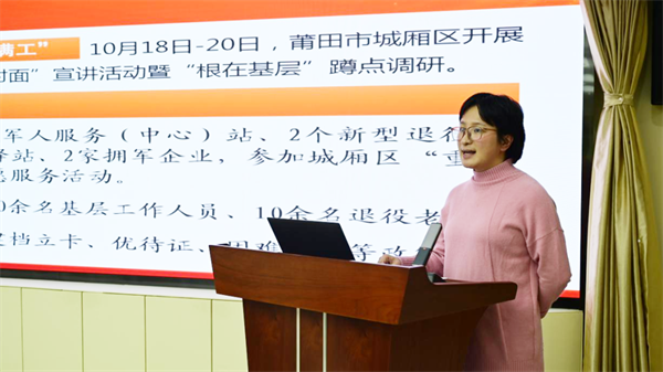 宣講演示員鄭平凡圍繞困難退役軍人幫扶援助主題,為大家宣講了困難幫扶方面的政策法規(guī),她坦言,通過宣講活動,不僅增進了自身業(yè)務(wù)知識,也增進了與服務(wù)對象之間的感情,收獲良多,感觸很大。
