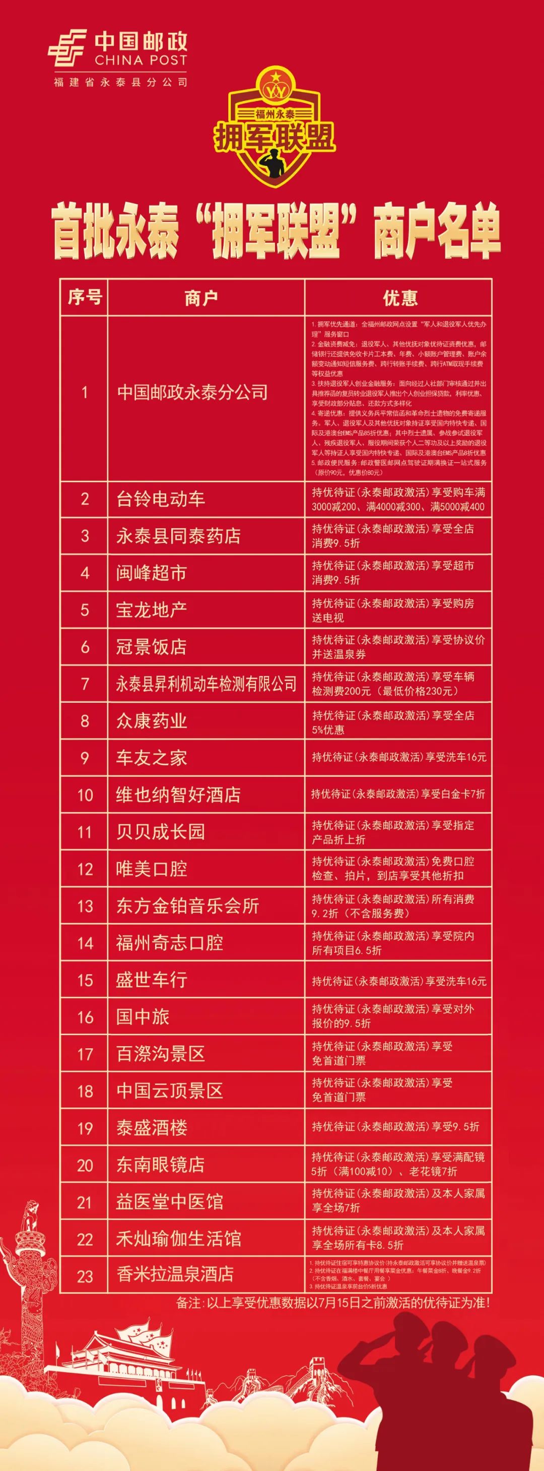 1月11日,福州市永泰縣舉行“擁軍聯(lián)盟”揭牌儀式。 目前,永泰縣“擁軍聯(lián)盟”共有商戶23家,將在商貿(mào)商超、金融保險、餐飲娛樂、醫(yī)療康養(yǎng)、文化旅游、交通物流、教育培訓(xùn)、商品房銷售等方面為退役軍人提供優(yōu)惠商品和優(yōu)質(zhì)服務(wù)。