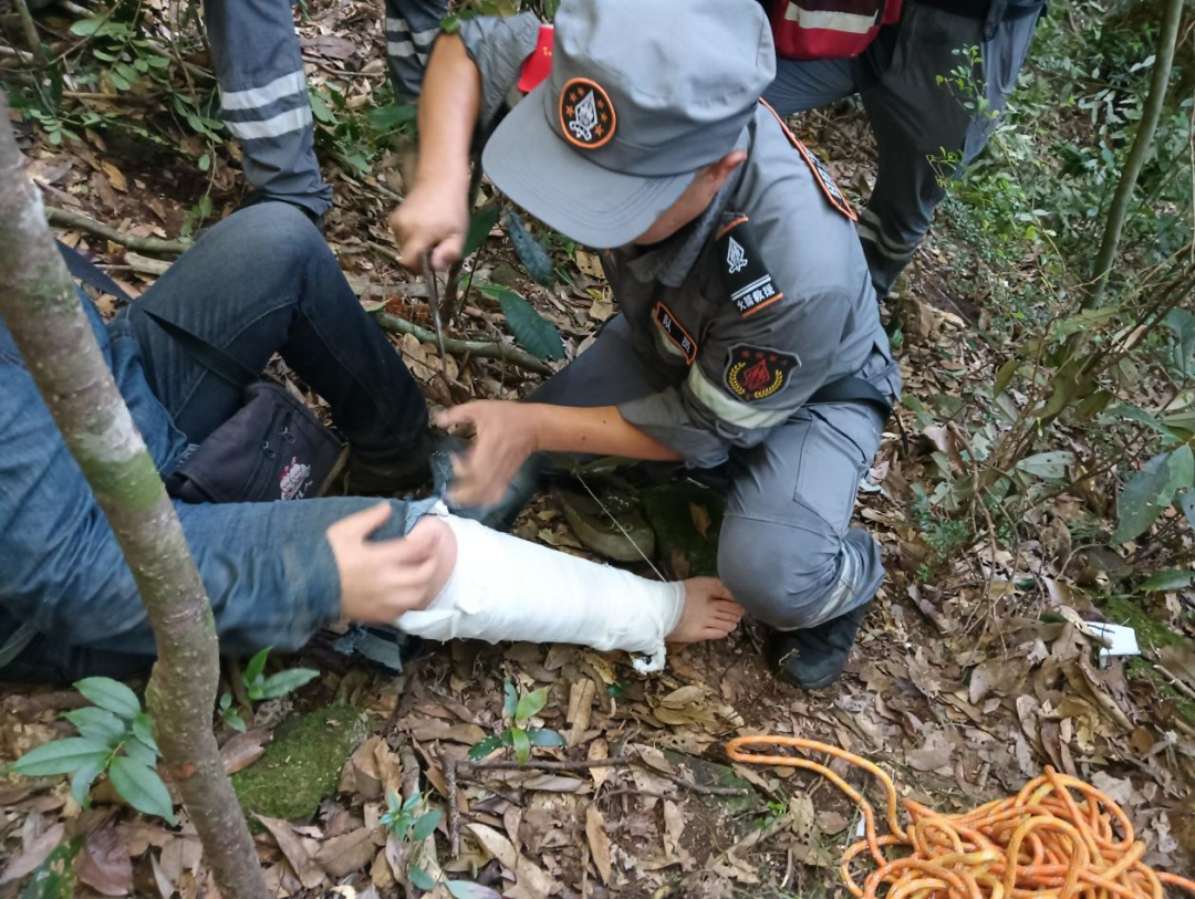 情況危急,明溪縣火箭救援隊第一時間啟動應(yīng)急救援機制:一方面,隊員通過電話耐心安撫求助者慌亂的情緒,逐字逐句詢問受傷人員的具體位置、周邊植被特征、是否有明顯參照物及傷勢細節(jié),為后續(xù)救援精準定位;另一方面,迅速調(diào)集8名具備專業(yè)急救、山地搜救經(jīng)驗的退役軍人隊員,攜帶折疊擔架、醫(yī)用夾板、消毒藥劑、急救包、照明設(shè)備等全套救援物資,分乘兩輛救援車火速趕往事故發(fā)生地所在的山腳下。 抵達山腳后,隊員們顧不上擦拭額頭的汗水,也來不及休整適應(yīng)午后山路的悶熱潮濕,便背著沉甸甸的救援裝備,沿著雜草叢生、坡度陡峭的山道徒步前行。經(jīng)過近 50分鐘的艱難跋涉,救援隊伍終于在山腰處找到受傷群眾。 經(jīng)隊員初步檢查,傷者腿部存在明顯腫脹、畸形,疑似發(fā)生骨折,且傷口處有輕微滲血。救援人員立即按照專業(yè)急救流程展開處置:一名隊員蹲在傷者身旁,輕聲安撫其情緒,分散其注意力;另一名隊員小心翼翼地用生理鹽水為傷者傷口進行清洗消毒,避免感染;隨后,兩人默契配合,將醫(yī)用夾板精準貼合在傷者骨折腿部兩側(cè),用繃帶進行均勻纏繞固定,確保松緊度適宜,既能起到支撐保護作用,又不會影響血液循環(huán);最后,用無菌紗布對傷口進行妥善包裹,最大限度避免后續(xù)移動過程中造成二次傷害。