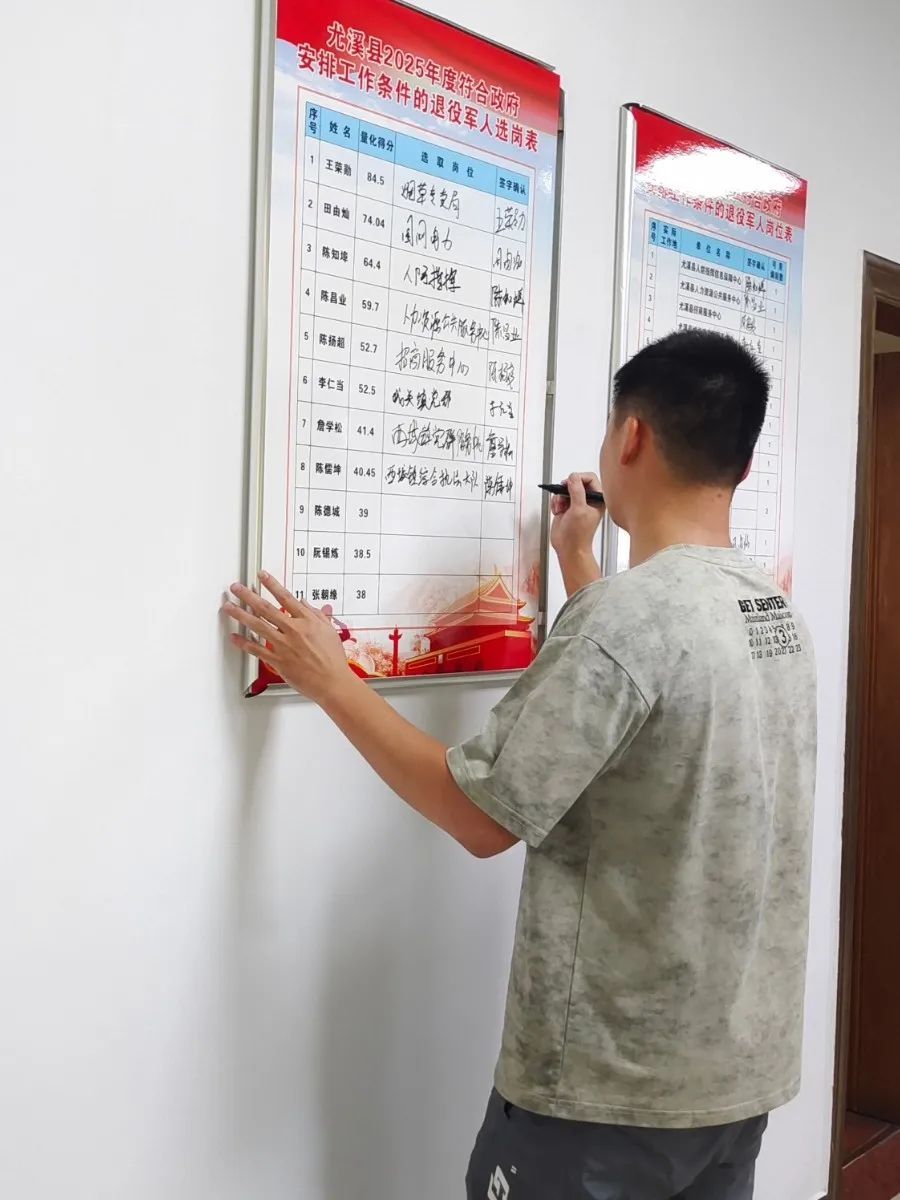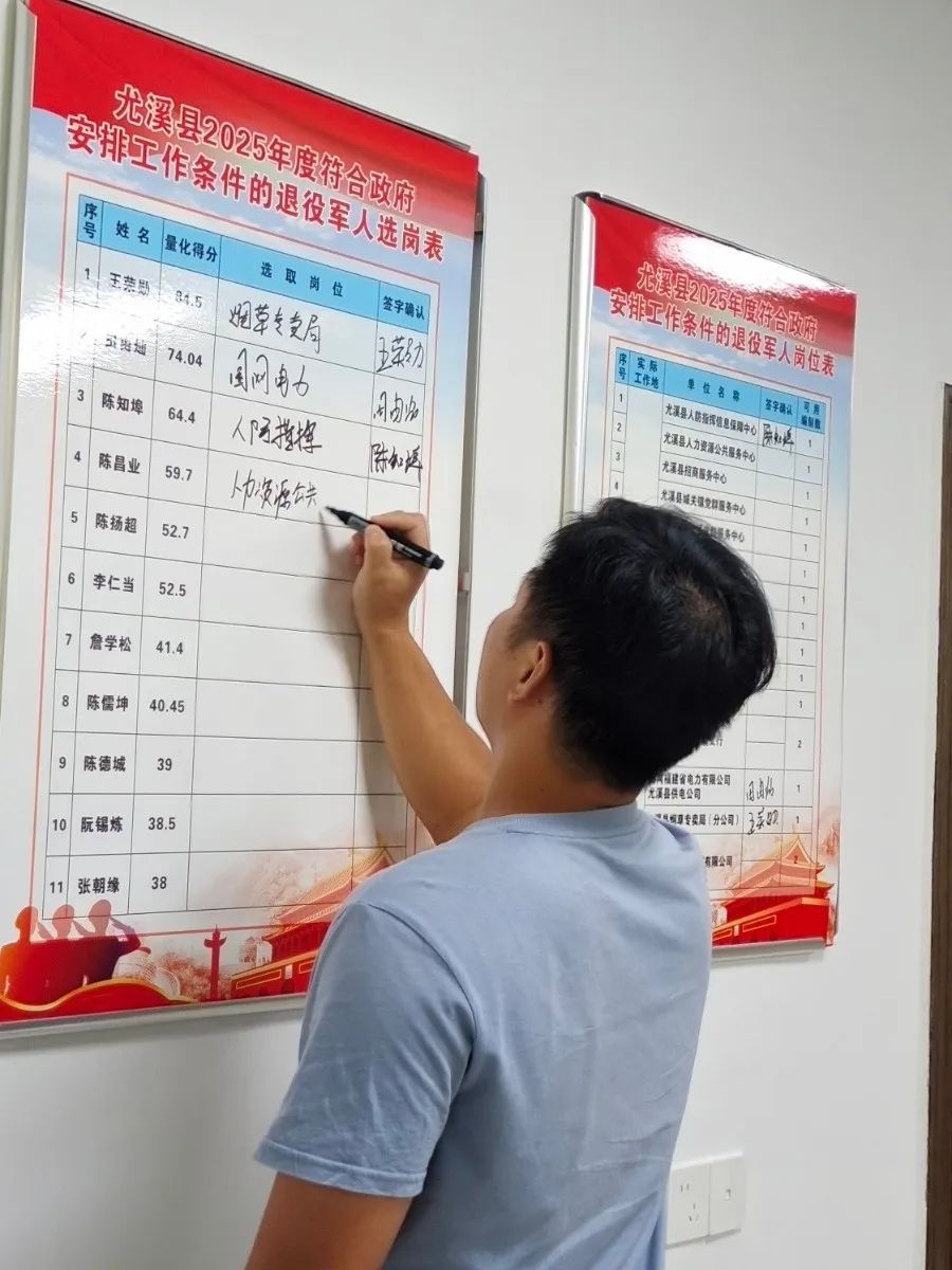 選崗會(huì)上,轉(zhuǎn)業(yè)軍士們嚴(yán)格依據(jù)量化評(píng)分結(jié)果,按分?jǐn)?shù)從高到低依次選崗,并現(xiàn)場(chǎng)簽字確認(rèn)??h駐縣委政法委紀(jì)檢監(jiān)察組對(duì)全過程進(jìn)行監(jiān)督,確保選崗工作陽(yáng)光透明、公平公正,讓每位軍士都能在公開的環(huán)境中安心選擇。 清流縣 近日,三明市清流縣2025年度符合政府安排工作退役軍士“陽(yáng)光安置”選崗工作圓滿完成。 清流縣民政和人力資源社會(huì)保障局嚴(yán)格落實(shí)《退役軍人安置條例》,充分挖掘安置潛力、有效拓寬安置渠道,分別從縣直單位、鄉(xiāng)鎮(zhèn)、國(guó)網(wǎng)等精選出多個(gè)崗位,供退役軍士選擇。嚴(yán)格按照量化評(píng)分排名依次進(jìn)行選崗,5名退役軍士順利完成選崗。 尤溪縣 8月19日上午,三明市尤溪縣召開2025年度符合政府安排工作退役軍人公開選崗會(huì)。