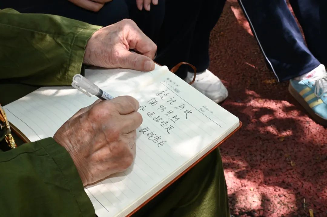 “張爺爺,您當(dāng)時(shí)害怕嗎?”“這枚紀(jì)念章對(duì)您來(lái)說意味著什么?”交流中,學(xué)生們踴躍提問,張老一一回答,并提筆勉勵(lì)大家:“銘記歷史,緬懷先烈,永遠(yuǎn)跟黨走!”寫到動(dòng)情處,他忍不住拍了拍學(xué)生的肩頭。