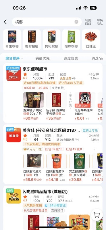 三明一學(xué)校附近,店鋪上方設(shè)置了醒目的檳榔廣告 電商平臺鮮有設(shè)限 記者也查看了多個(gè)電商平臺,發(fā)現(xiàn)眾多檳榔產(chǎn)品琳瑯滿目,青果檳榔、咖啡檳榔、爆珠檳榔、枸杞檳榔、醬香檳榔等品類齊全,只需下單支付便可快速送達(dá),對買家是否成年并無特殊限制。 在美團(tuán)外賣定位福州,除了門店密集的萬嘉便利、六意便利、京東便利店等有檳榔在售,還有一刻便利、7+便利店、便利先生、鑫萬超文體便利(晨光文具)、佳盛文具便利、米熊倉鼠超市、奈斯優(yōu)選生活超市等均有售賣,買家可根據(jù)地域、喜好隨時(shí)下單。將定位調(diào)整為莆田、南平、寧德、三明、泉州等地,也有眾多店家提供檳榔外賣。 除了美團(tuán),記者也嘗試了永輝、樸樸、沃爾瑪、大潤發(fā)等線上平臺,未見檳榔銷售。不過,餓了么、多多買菜、淘寶、京東、拼多多等電商平臺大都貨品齊全,有的可選擇即時(shí)送貨,有的只能次日自提。就連閑魚也有檳榔可買。 檳榔在全省各地大行其道,唯有廈門較為特殊。在外賣平臺定位廈門搜索檳榔時(shí),出現(xiàn)的是“搜索結(jié)果為空”的提示。不過,這并不妨礙有心人從淘寶、京東等平臺下單購買。