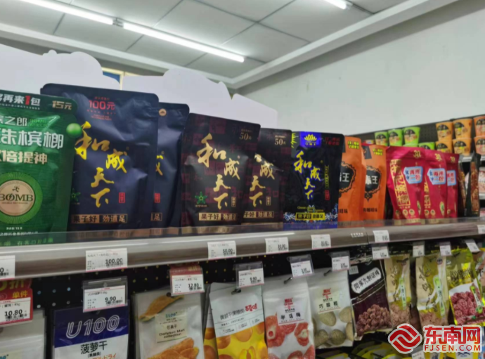 福州一小學旁的便利店,大排檳榔占據(jù)貨架上層。東南網(wǎng)記者馮旭 攝